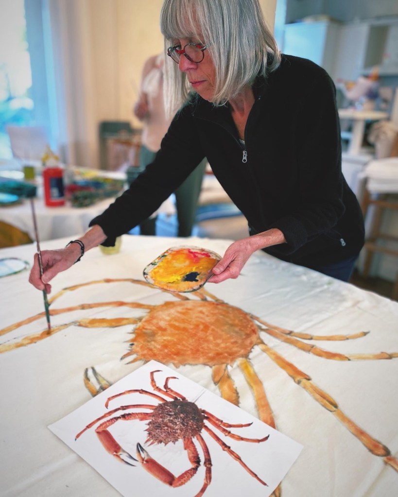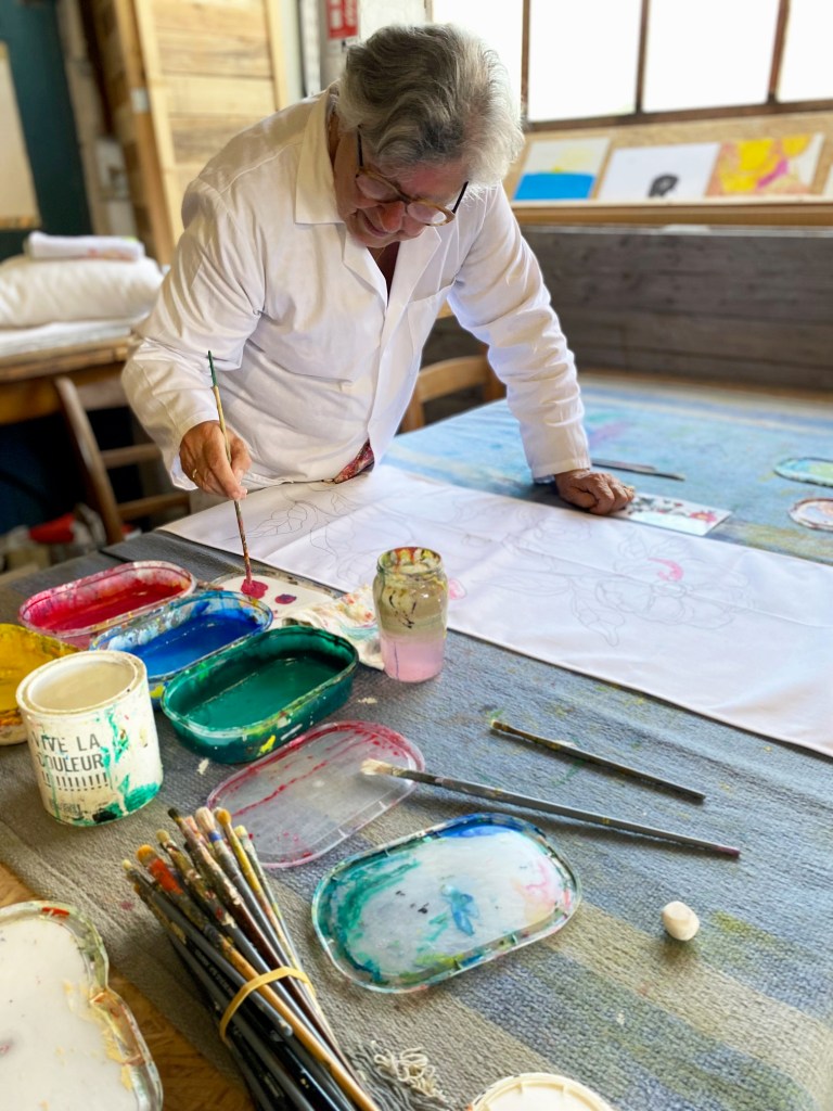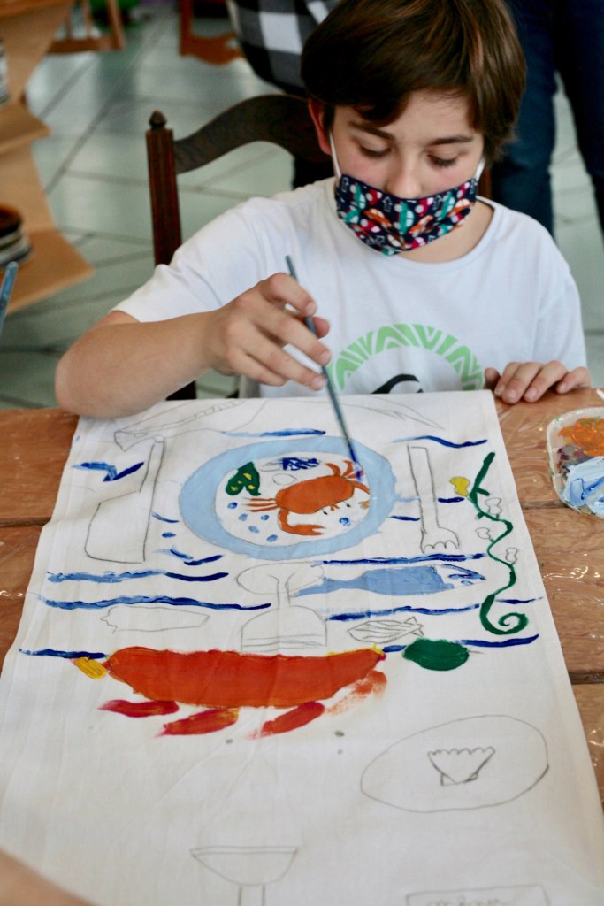 Sujet CULINAIRE – illustrations réalisées par des élèves en vue d’une tenture ou desserte pour la cuisinesujet AUTOMNAL – ébauche au crayon fusain puis mise en couleur du motif sur un tablier en drap anciensujet BOTANIQUE – atelier animé dans le cadre d’une activité « loisir créatif » organisée par le centre INDIGO (Sèvremoine 49)personnalisation d’un tee shirt lors d’un atelier donné à Préfailles (44) pour l’association « La Vague Eco Créative »illustration d’une pivoine lors d’un atelier et confectionné en coussin avec un dos contrastéexemples de supports confectionnés dans des draps anciens proposés lors des atelierssujet MER – réalisation par une élève d’un motif d’araignée de mer sur un tablierdétail d’une tenture d’après une affiche rétro année 20chemin de table en lin sur lequel sont peints des oiseaux du littoral – atelier donné à Préfailles (44) pour l’association « La Vague Eco Créative »illustration d’une toile de transat dans le cadre d’un atelier proposé pour l’association « La Vague eco Créative » personnalisation d’un TOTE BAG – sujet MERsujet CULINAIRE – personnalisation d’un chemin de table dans le cadre d’un atelier pour enfant donné à la « Cocotte Solidaire » à Nantessujet MER – tablier avec un motif de poulpeatelier parent/enfant proposé lors du salon des Métiers d’Art de Nantes en déc 2023