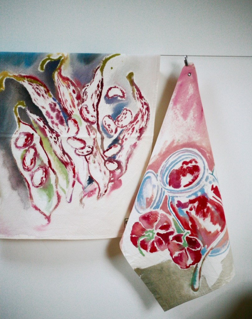 Cette thématique se décline en panneaux, tentures et coussins évoquant les torchons de cuisine de nos grands mère, leurs tabliers, et leurs généreux ustensiles…