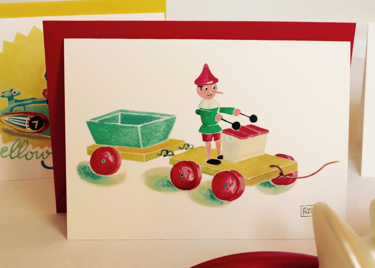 #illustrationmarionpeeters #cartesaquarelle#naissance#jouetsvintage#pinochio